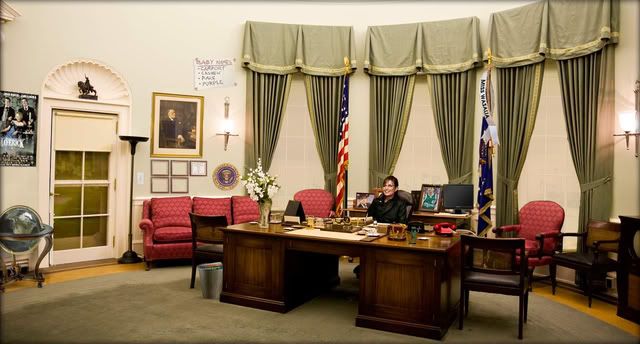Wow! I bet many of you were getting all up in arms when you read that title, "Palin as President". Well, even though we love Sarah Palin and think she is just the gosh darn cutest thing, the Palin-as-President interactive website is not a pro-Palin work. "Updated daily until November 4th", the web page gives us insight into the hypothetical question, if you've ever wondered, "What would the Oval Office look like if Sarah Palin were President?"