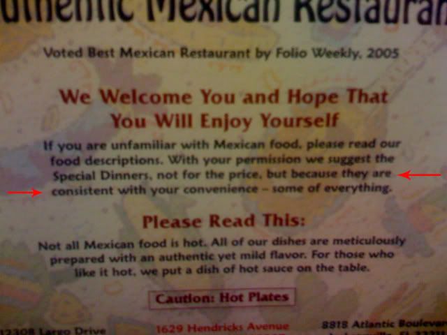 You guys might remember this post from wayyy back in July of 2007. We noticed during a routine staff meeting at La Nopalera that there was a pretty incoherent mash of words on the front of their menus. Well, the peeps over at "La Nop" had new menus done recently and they still didn't correct the error. Check it!
