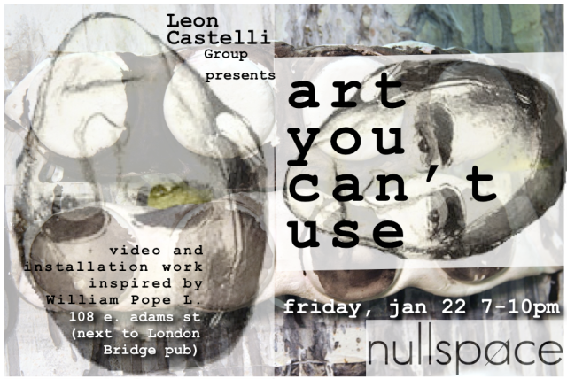 A new art gallery/studio has opened Downtown (108 East Adams Street) called Nullspace. Curated by its owners, Mark Creegan, Kurt Polkey, and Jefree Shalev, the inaugural show, presented by the Leon Castelli Group and titled "Art You Can't Use", will take place tomorrow, January 22, between 7 and 10PM; the show runs through Feb 19th. Support local art.A brief description of the show: "William Pope L is an iconoclastic performance artist whose themes include economics, race, disenfranchisement, and cultural values. Using Pope L's life and career as a jumping off point, Mark Creegan, Kurt Polkey and Jefree Shalev will bring drawing, performance art, installation and video together to create a cohesive jumble of ideas around those themes."