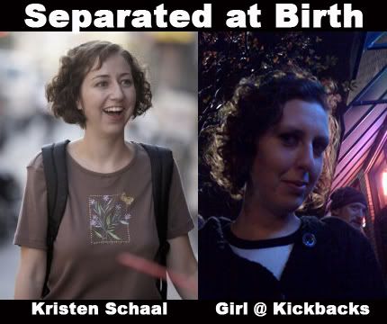 Today's Separated at Birth is brought to you by Steve at Kickbacks Gastropub. Steve noticed that the bar regular below looks just like that chick, Kristen Schaal, from the HBO show Flight of the Conchords. Check this out...