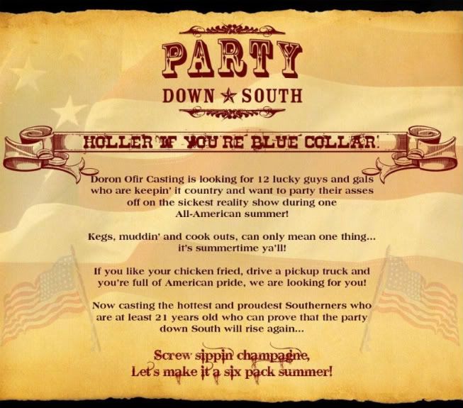 The creators of MTV’s guido-fest Jersey Shore are currently casting for a Southern version called Party Down South and are looking for keg tappin', mud ridin', Skynyrd lovin', God fearin', honky tonkin' Southern folk. No doubt there HAS to be someone from Jacksonville to represent, CLICK HERE to apply DUVAL!!!! This show is going to be off the chain. ”Screw sippin champagne, let’s make it a 6-pack summer!”