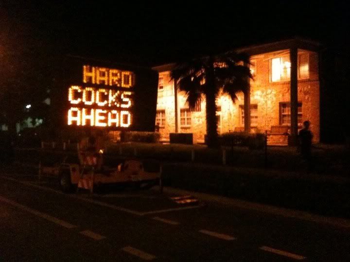 We’ve got another hijacked construction sign for you guys, but this time there’s no political agenda. Jacksonville Confidential reader Joe sent in this picture of a sign in front of his son’s frat house in Gainesville warning of ”Hard Cocks Ahead”. The message was displayed for over seven hours and a plethora of emergency room visits for lock jaw were reported that night. GO GATORS!!!!