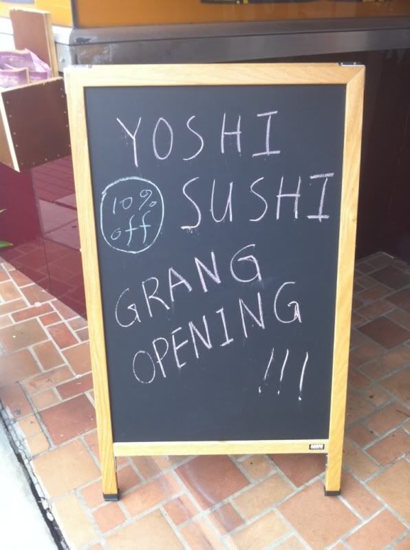 We just wanted to let everyone know that the newest sushi restaurant in supersaturated Riverside/5 Points, Yoshi Sushi, just had its GRAND GRANG OPENING”. Such a treat and what a way to start out, already providing us with some Engrish.
