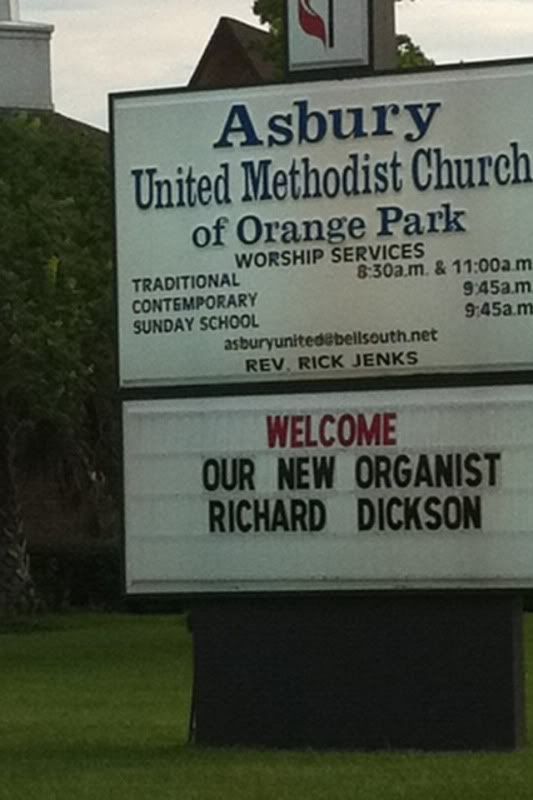 No, we aren't talking about our Editor Jason, we're talking about the brand spanking new "Organist" at Asbury United Methodist Church of Orange Park at the corner of Blanding Boulevard and College Drive just south of us. You know that Richard Dickson was bred to tickle some ivories (and God knows what else; pun intended) with that name. Thanks to Tim for sending this awesome sign over to our News Room Chief Mark last night. You can't make this shiz up.