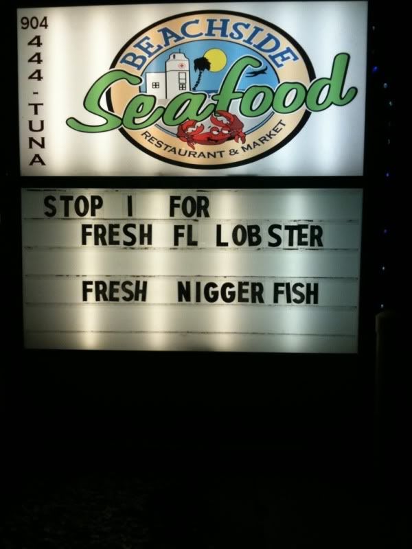 Holy Cow! This is just WRONG. Some vandal swapped the letters around on the signage outside of Beachside Seafood Restaurant & Market (120 3rd Street,Jacksonville Beach) over the weekend. Jacksonville Confidential reader and frequent contributor Russ spotted the racist blurb and immediately called the restaurant to inform them. Well, immediately after he snagged a picture and sent it over to us, of course! Shame on you random letter swapper, shame…